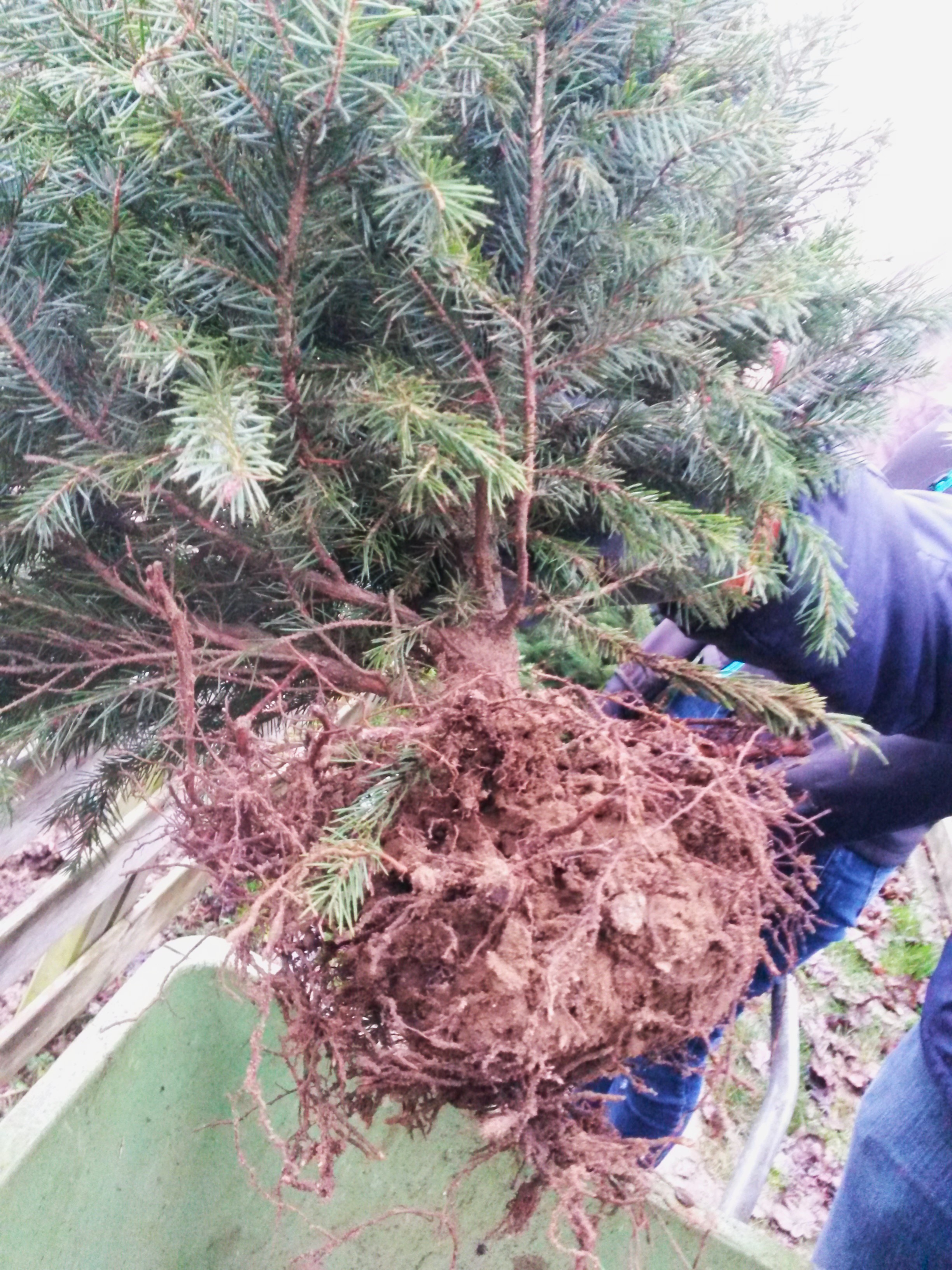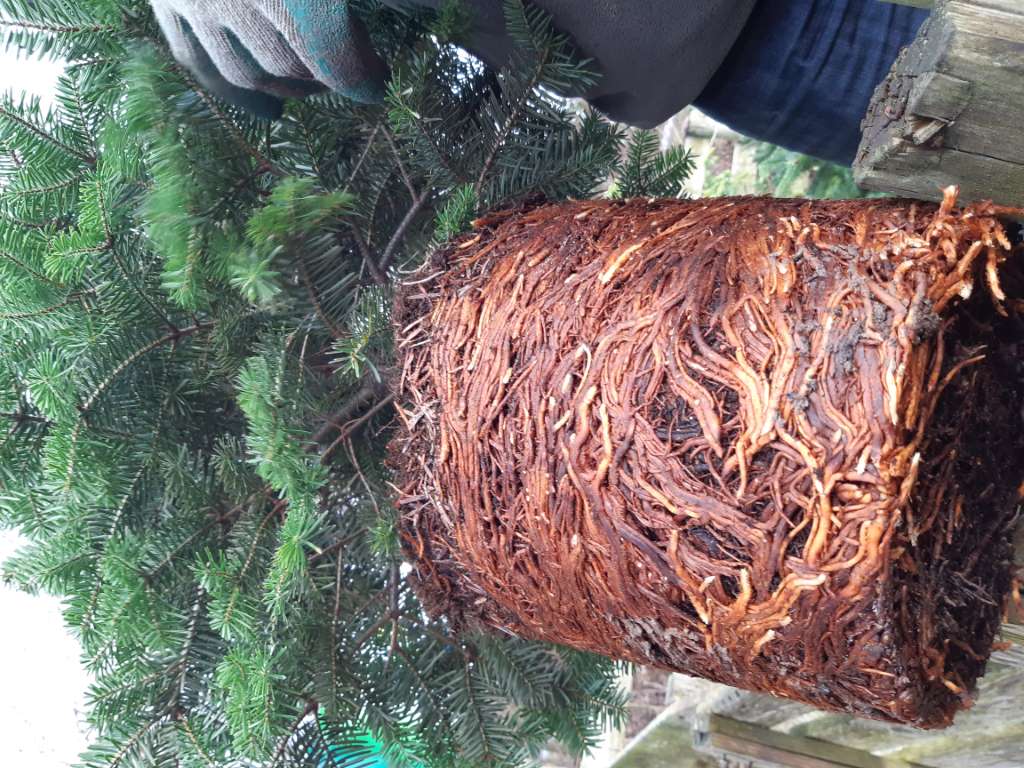 Misschien een inkoppertje, maar als je een kerstboom wilt kopen met een kluit, let er dan op dat de boom in een pot is gekweekt, of tenminste een goed ontwikkeld wortelstelsel heeft. We hebben bij onze kerstbomenlogeertuin namelijk gemerkt, dat veel bomen die met kluit worden verkocht, niet veel kans maken om weer te gaan groeien. Waarom? De wortels zijn vaak veel te kort afgehakt.